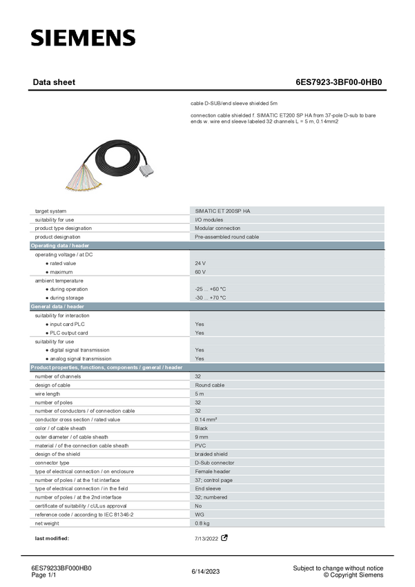 Przewód Siemens 6ES7923-3BJ00-0HB0 6ES79233BJ000HB0
