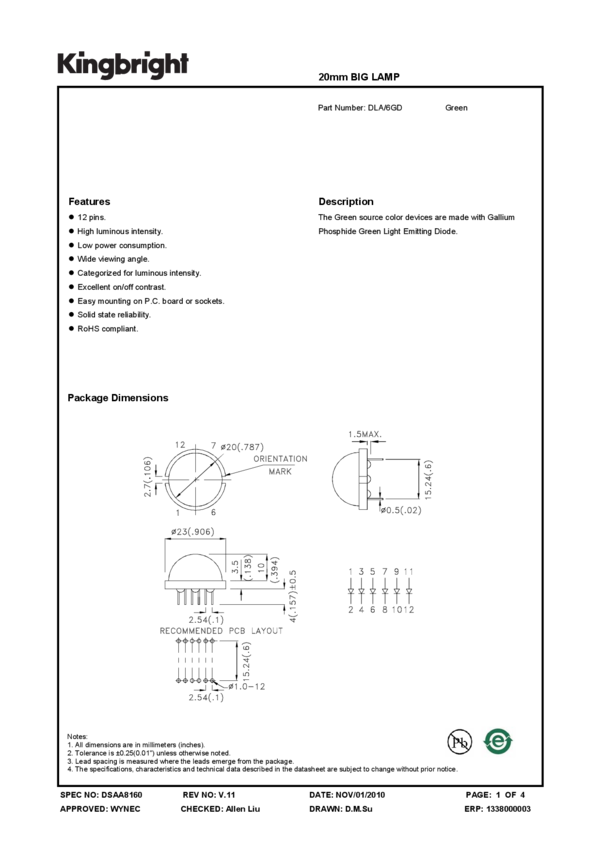 LED Uni-Color Green 568nm Standard LED 12-Pin Tube