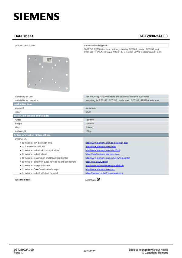Siemens 6GT2890-2AC00 Płytka mocująca
