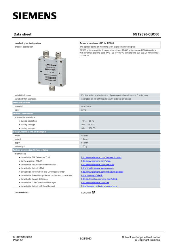 Siemens 6GT2890-0BC00 Rozgałęźnik antenowy