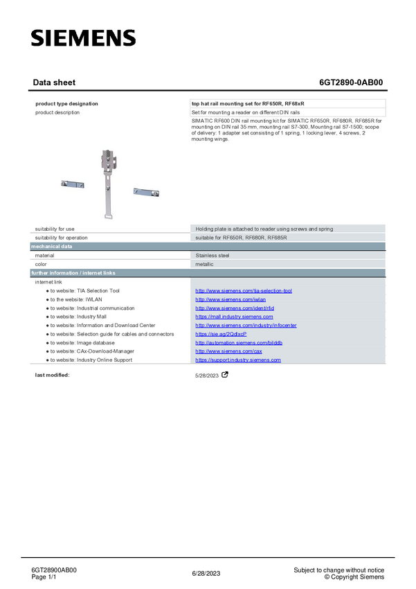 Siemens 6GT2890-0AB00 Zestaw do montażu na szynie top-hat
