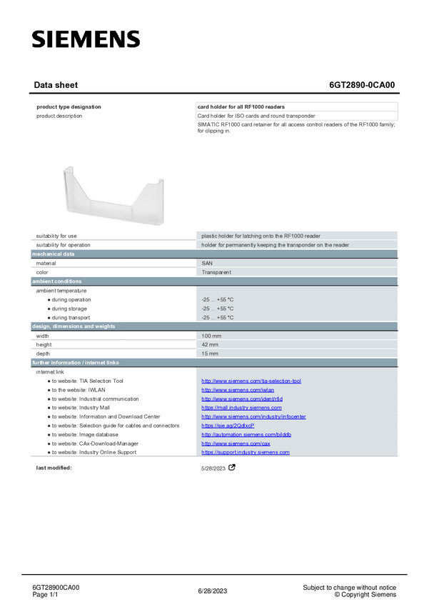 Siemens 6GT2890-0CA00 Uchwyt na kartę