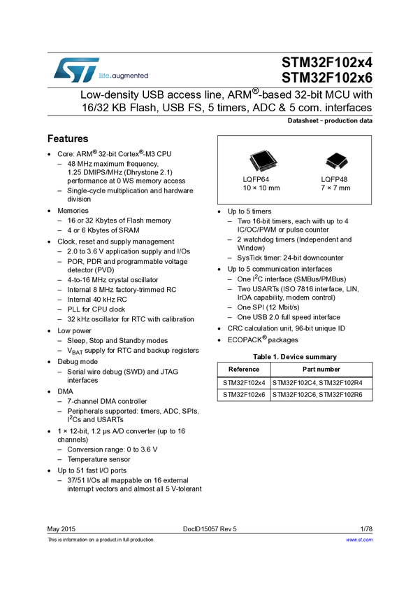 Układ scalony; STM32F102C6T6A; mikrokontroler ARM; Flash: 32kB; 48MHz; SRAM: 6kB; LQFP48; SMD; RoHS