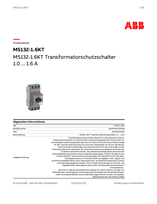 Wyłącznik automatyczny transformatora ABB MS132-1.6KT Zakres ustawienia (Prąd): 32 A (max) Maksymalne napięcie przełącza