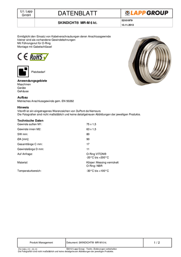 LAPP 52101979 SKINDICHT MR-M 75X1,5/63X1,5 6KT., M75, M63, 1 szt.