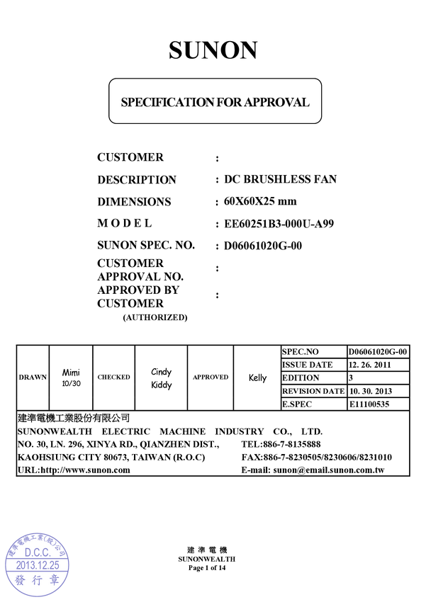 Wentylator DC; EE60251B3-000U-A99; osiowy; 12VDC; 60x60x25mm; 0,6W; 23,6m3/h; 20dBA; 26AWG; SUNON; RoHS