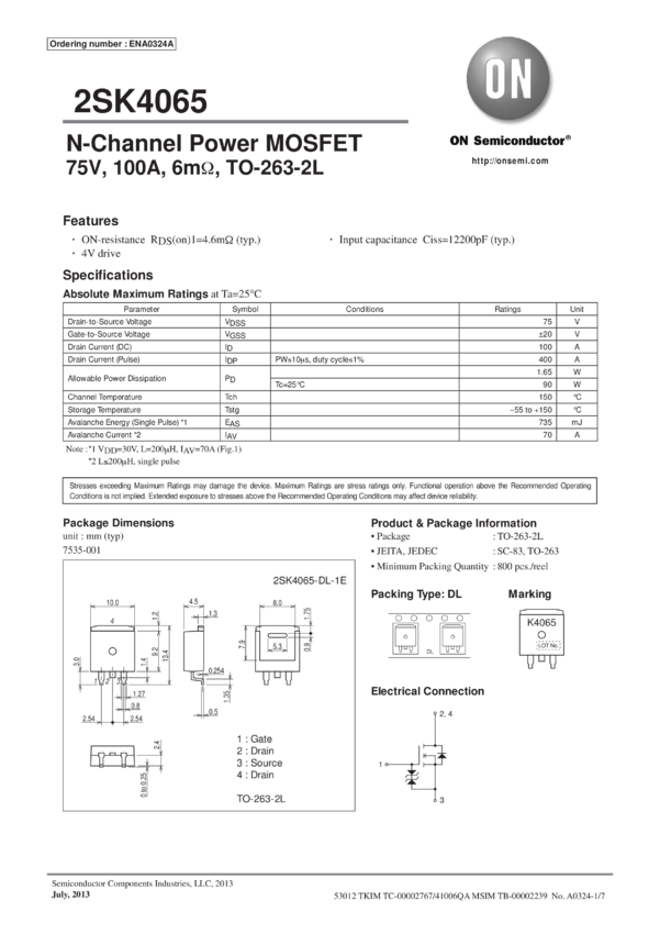 N-Channel Power MOSFET, 75V, 100A, 6mOhm, TO-263-2L
