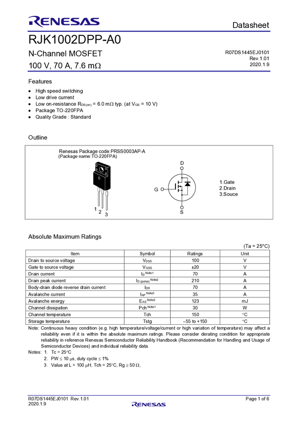 Nch Single Power Mosfet 100V 70A 7.6Mohm To-220Ab