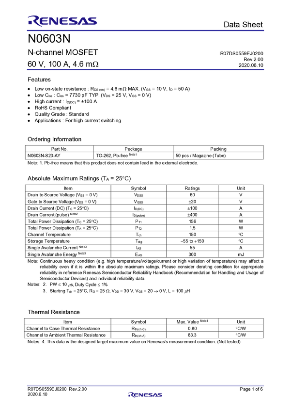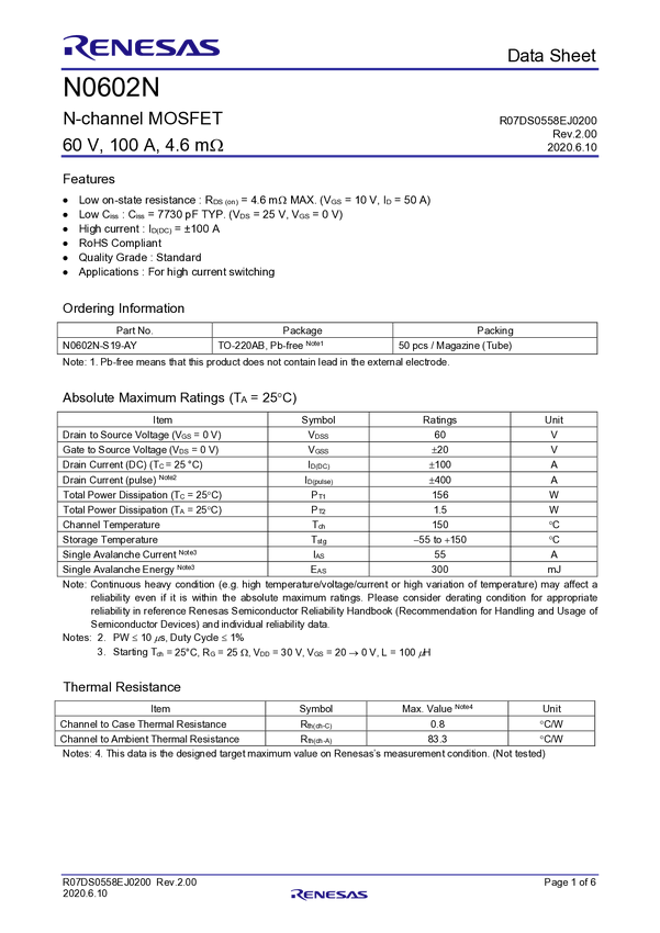 Nch Power MOSFET 60V 100A 4.6mohm TO-220