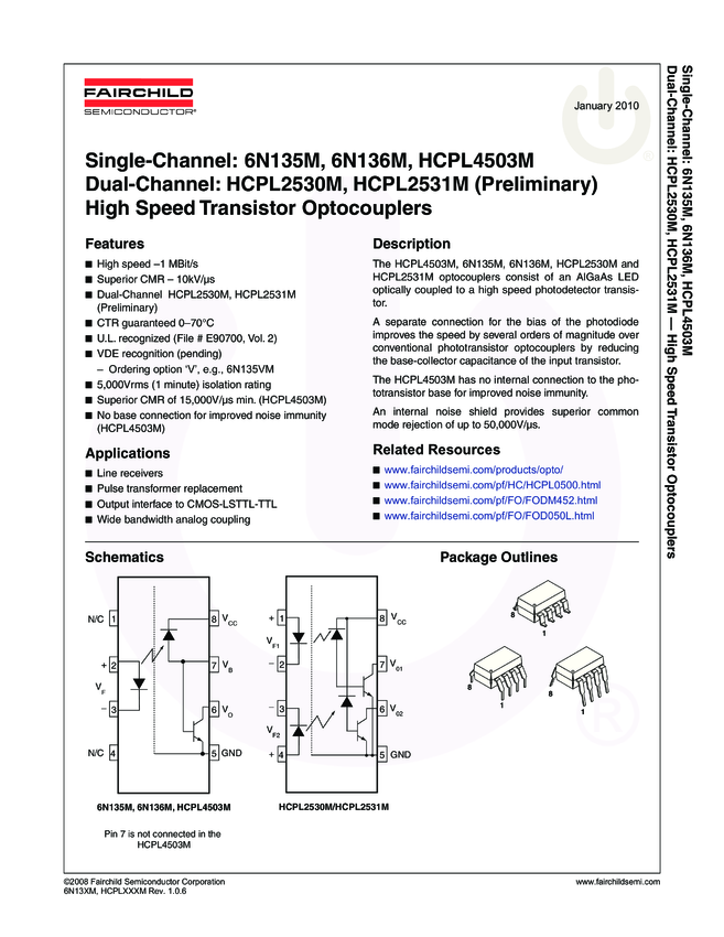 8-Pin DIP 1 Mbit/s Single-Channel High Speed Transistor Output Optocoupler No Base