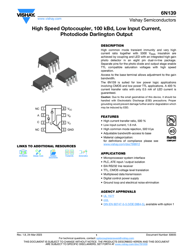 High Speed Optocoupler, 100 kBd, Low Input Current, Photodiode Darlington Output