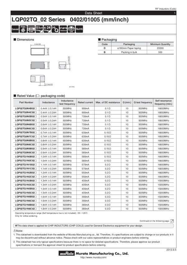 Ind RF Chip Thin Film 0.6nH 0.1nH 500MHz 10Q-Factor 730mA 01005 Paper T/R
