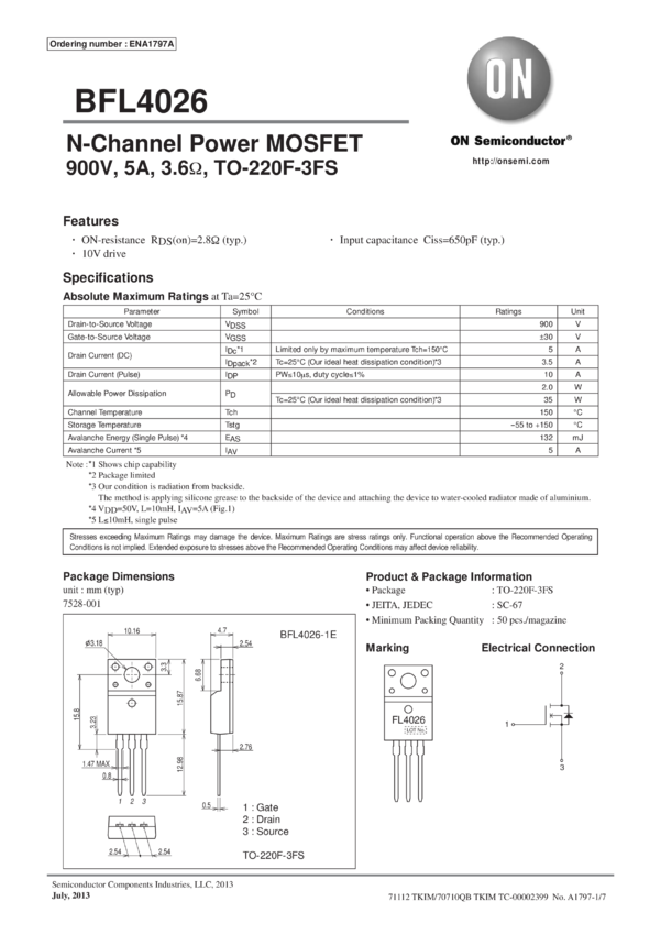 N-Channel Power MOSFET, 900V, 5A, 3.6Ohm, TO-220F-3FS