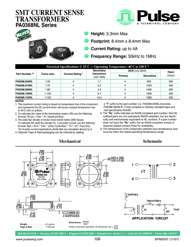 Current Transformer 1:70 500VAC 0.0025Ohm Prim.DCR 4.6Ohm Sec.DCR 7000mA Surface Mount