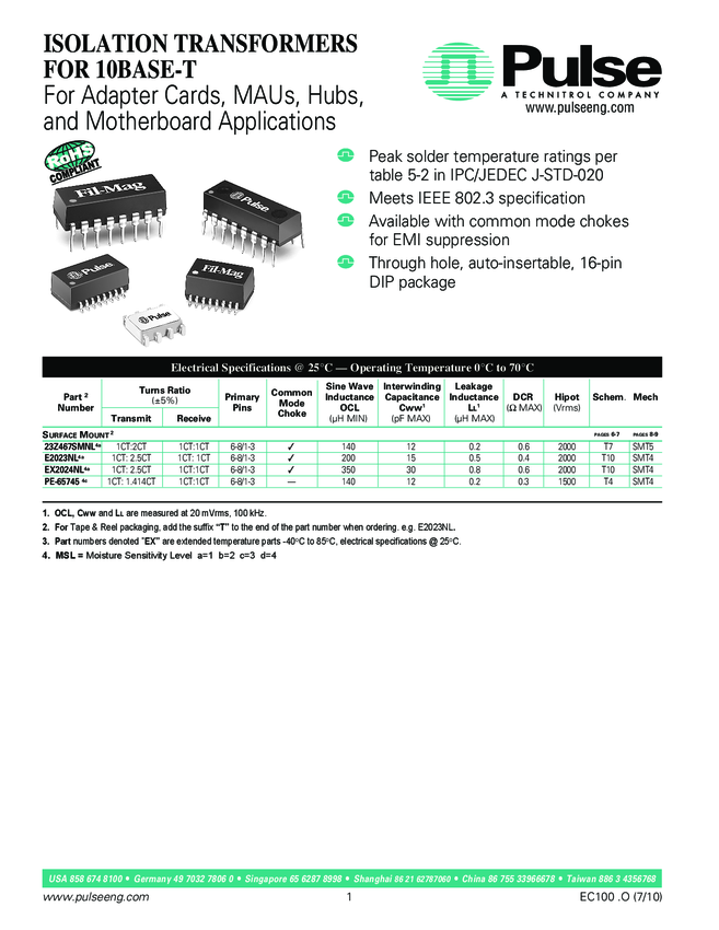 Telecom Transformer 1:2.5/1:1 2000Vrms 0.6Ohm Prim. DCR Surface Mount