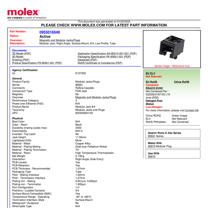 Molex gniazdo Molex 955016649 gniazdo Ilość pinów 6P4C 1 szt.