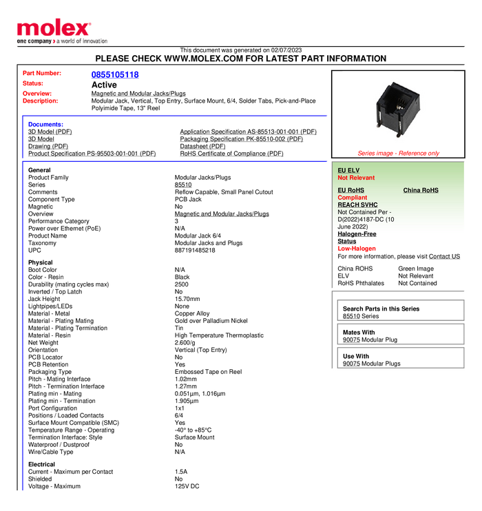 Molex 855105118 Złącze RJ, piny:6P4C, 1 szt.