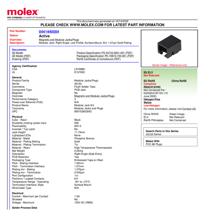 Molex gniazdo Molex 441440004 gniazdo Ilość pinów 6P4C 1 szt.