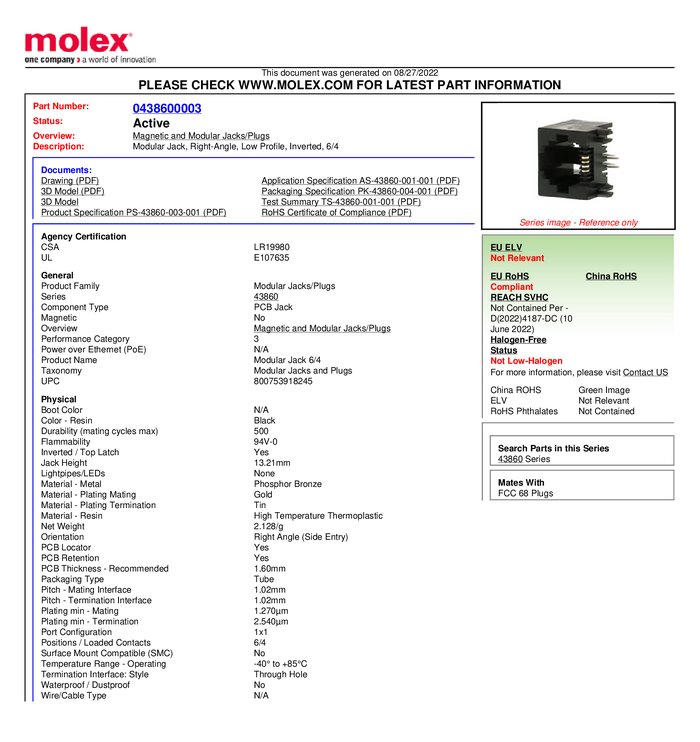 Molex gniazdo Molex 438600003 gniazdo Ilość pinów 6P4C 1 szt.