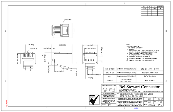 złącze męskie proste RJ12 BEL Stewart Connectors 940-SP-3066 Ilość styków: 6P6C 1 szt.