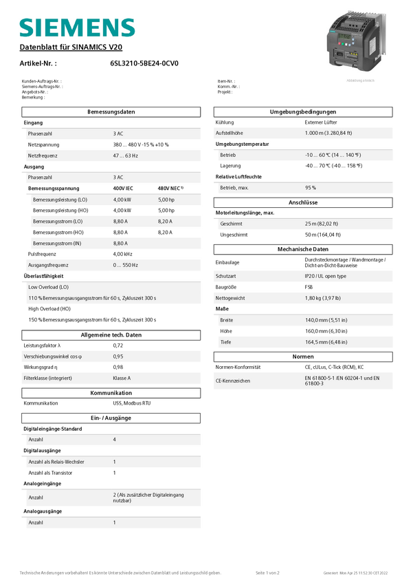 Przemiennik częstotliwości Siemens 6SL3210-5BE24-0CV0 4.0 kW 3-fazowy 400 V