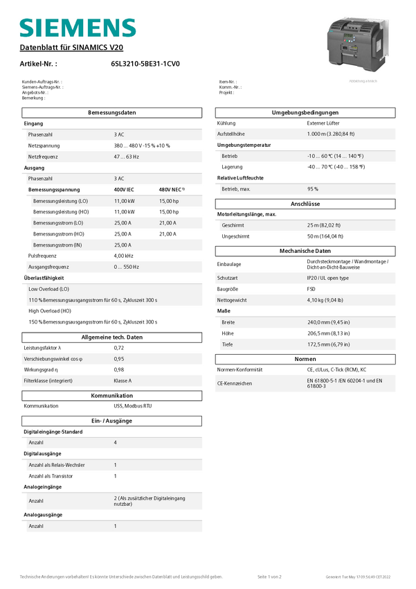 Przemiennik częstotliwości Siemens 6SL3210-5BE31-1CV0 11.0 kW 380 V, 480 V