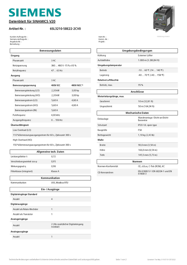 Przemiennik częstotliwości Siemens 6SL3210-5BE22-2UV0 2.2 kW 3-fazowy 400 V