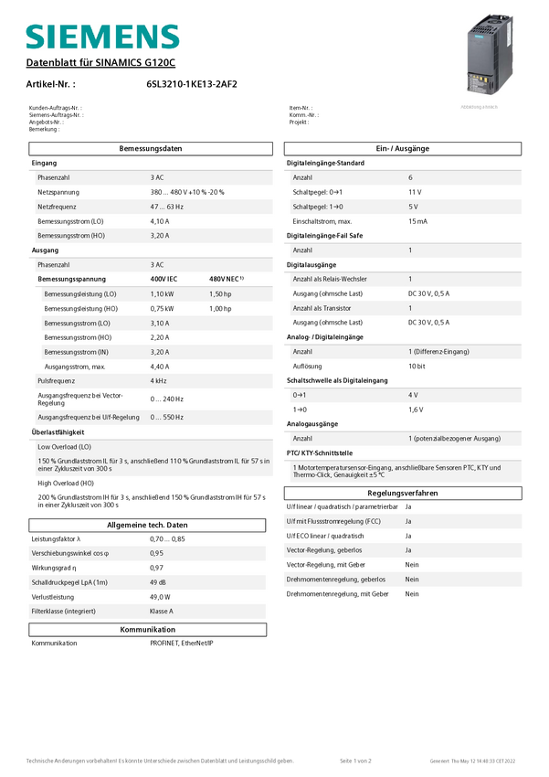 Przemiennik częstotliwości Siemens 6SL3210-1KE13-2AF2 0.75 kW 380 V, 480 V