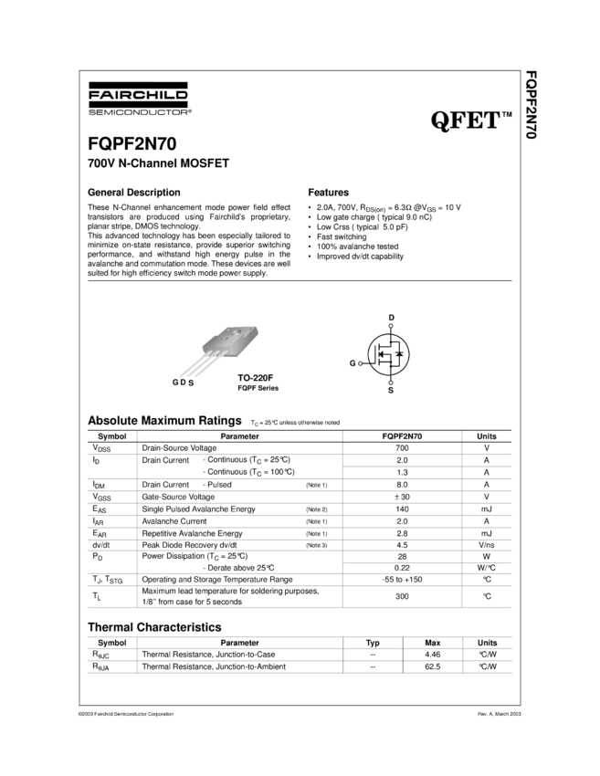 N-Channel QFET<sup>®</sup> MOSFET 700V, 2.0A, 6.3Ω