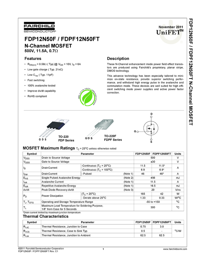 N-Channel UniFET<sup>TM</sup> FRFET<sup>®</sup> MOSFET 500V, 11.5A, 700mΩ