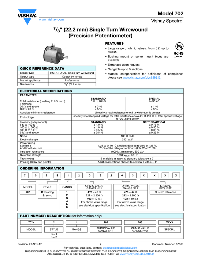 7/8" (22.2 mm) Single Turn Wirewound (Precision Potentiometer)