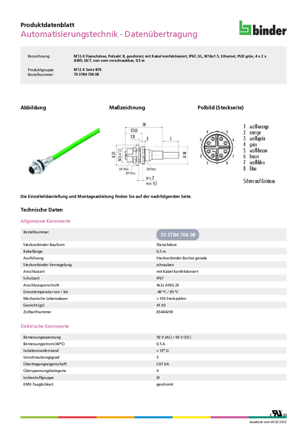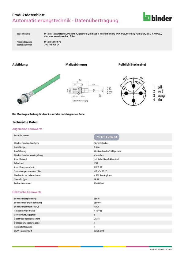 binder 70 3733 706 04-20 Złącze niekonfekcjonowane czujnika/aktuatora 70 3733 706 04, piny: 4, 0.5 m, 1 szt.