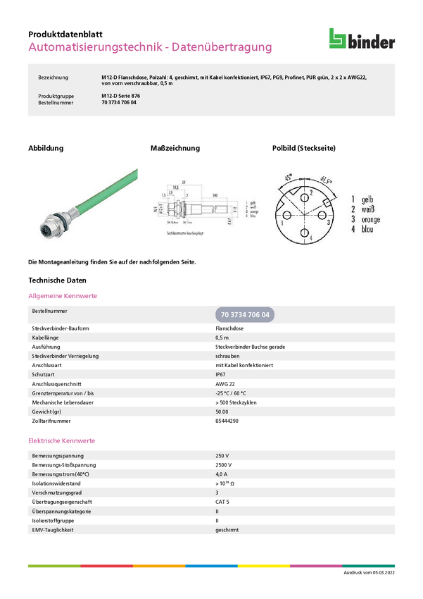binder 70 3734 706 04-20 Złącze niekonfekcjonowane czujnika/aktuatora 70 3734 706 04, piny: 4, 0.5 m, 1 szt.