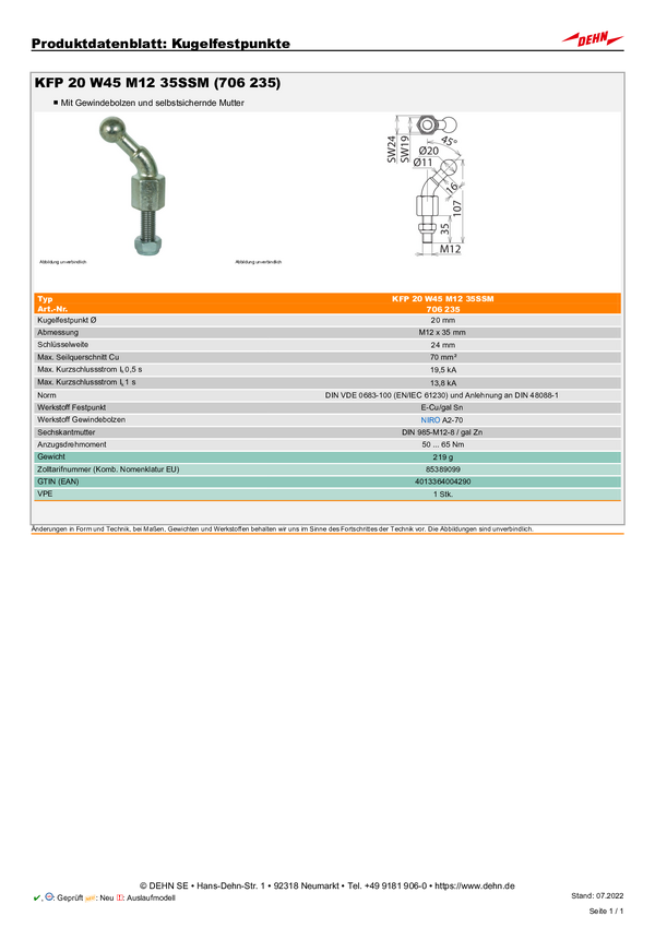 DEHN 706235 KFP 20 W45 M12 35SSM Sferyczny punkt stały 1 szt.