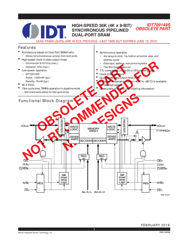 4K x 9 Sync, Dual-Port RAM, Pipelined