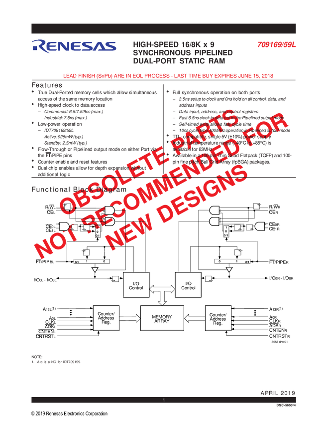 8K x 9 Sync, Dual-Port RAM, Pipelined/Flow-Through