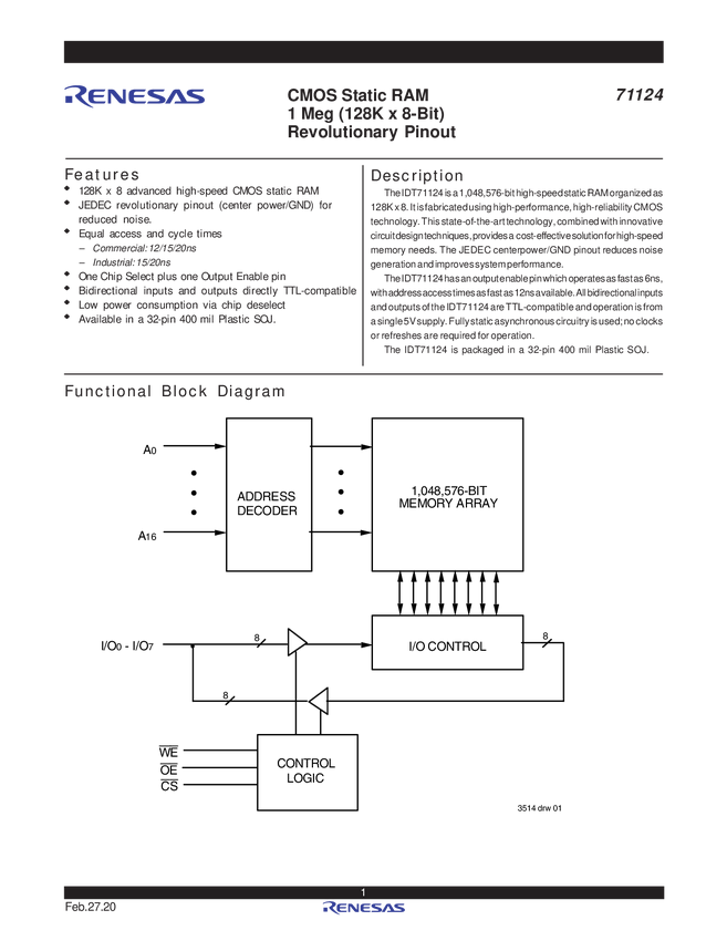 5.0V 128K x 8 Asynchronous Static RAM Center Pwr & Gnd Pinout