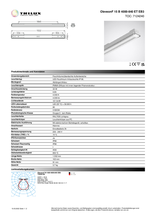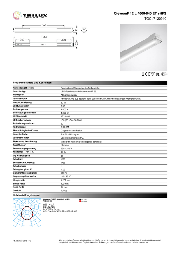 Lampa LED do wilgotnych pomieszczeń Trilux OleveonF1.5 #7125851 7125851, 44 W, 6000 lm