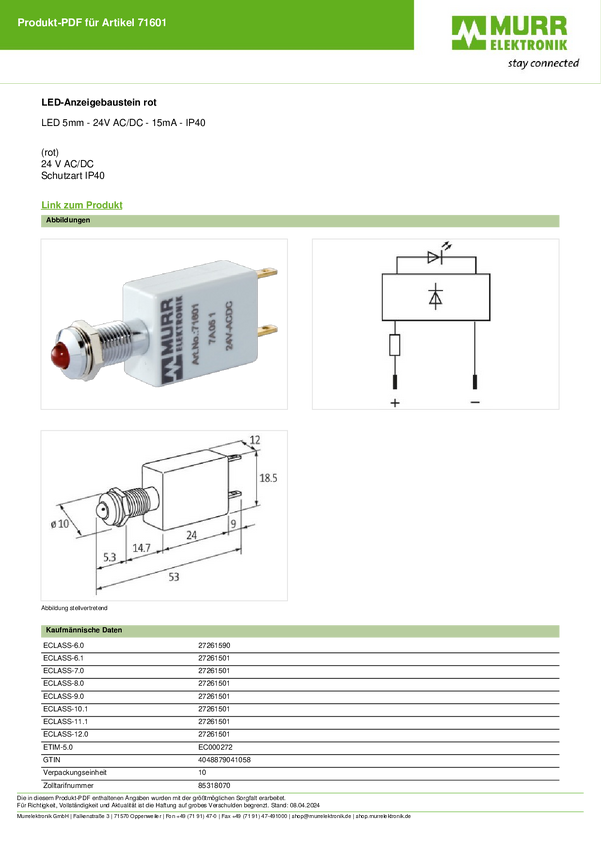 Lampka sygnalizacyjna LED Murrelektronik 71601 24 V DC/AC czerwony 24 V DC/AC 10 szt.