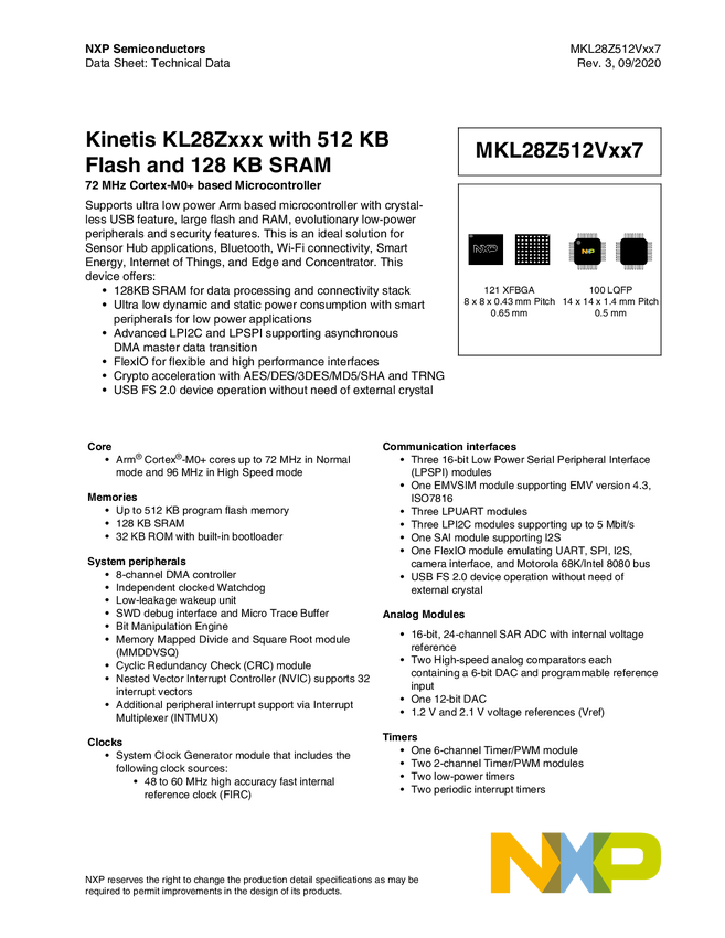 Kinetis L 32-bit MCU, ARM Cortex-M0+ core, 512KB Flash, 128KB RAM, 72MHz, USB OTG, 100LQFP