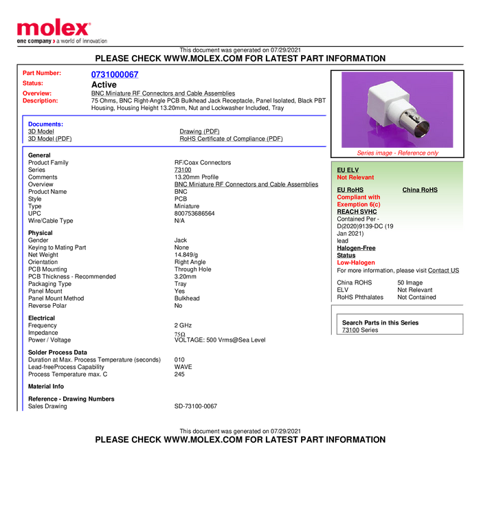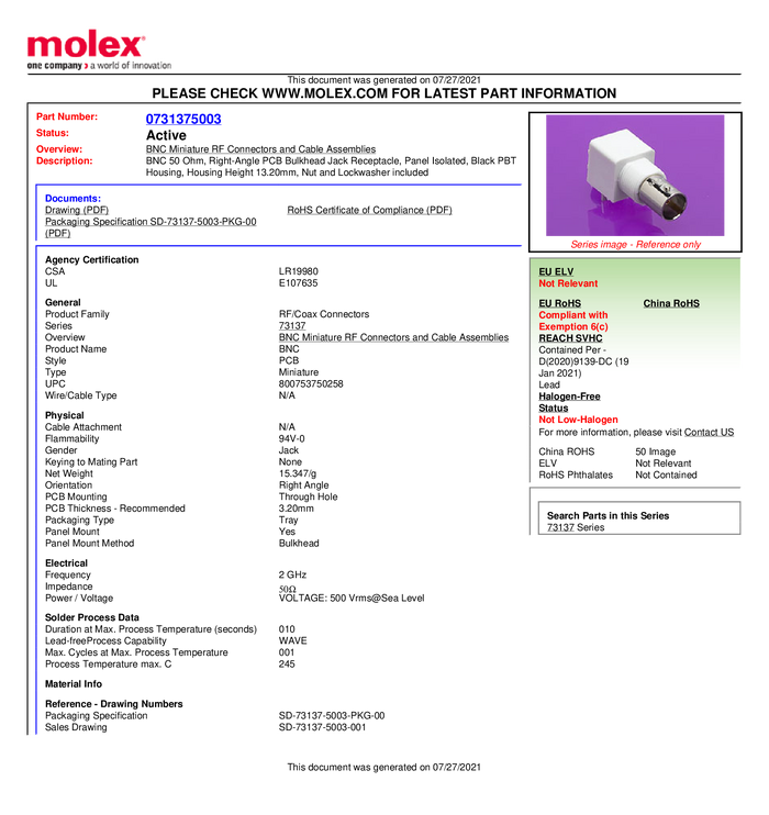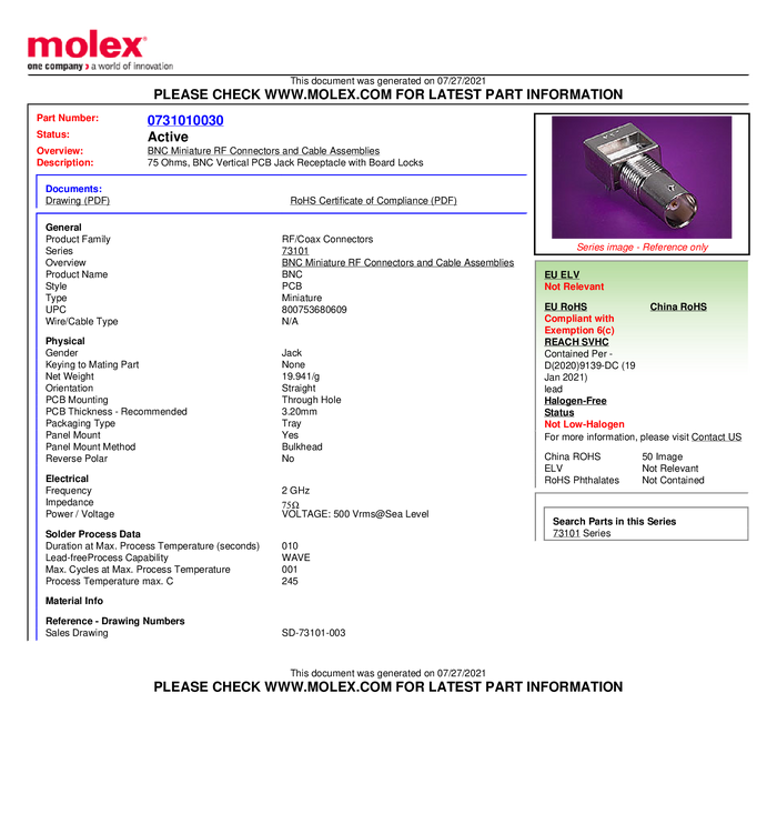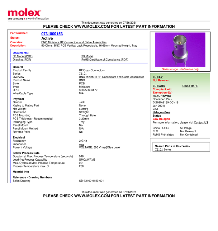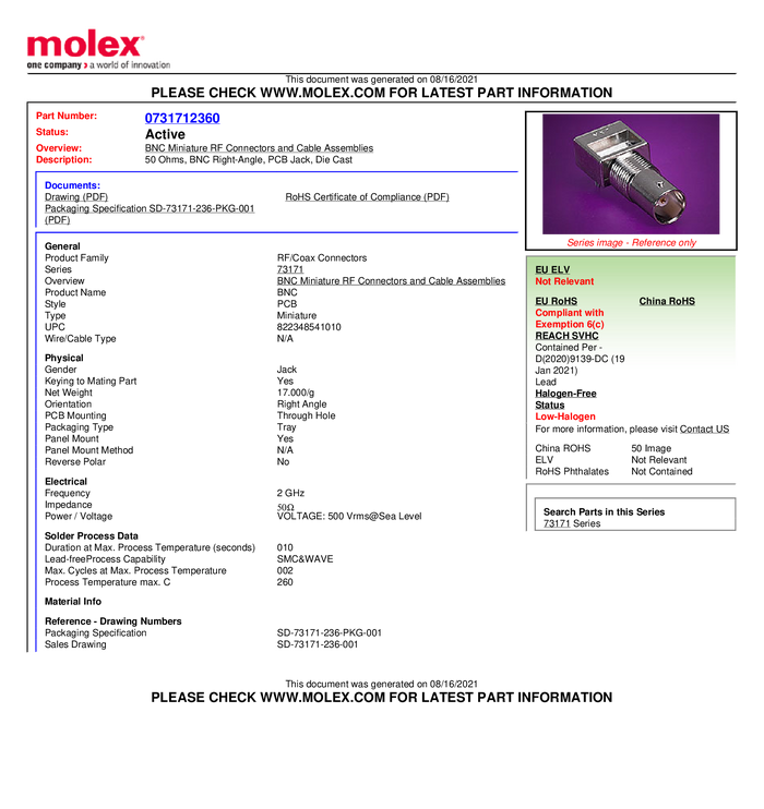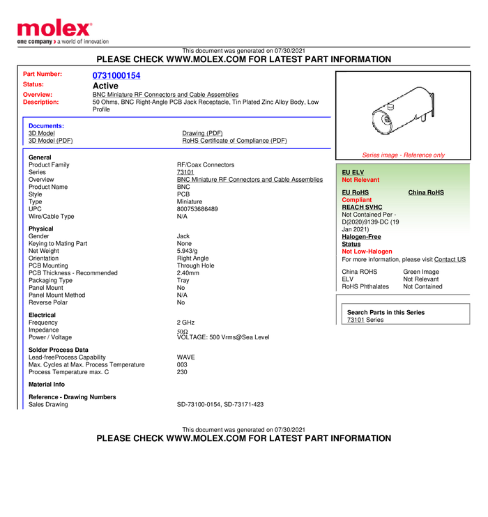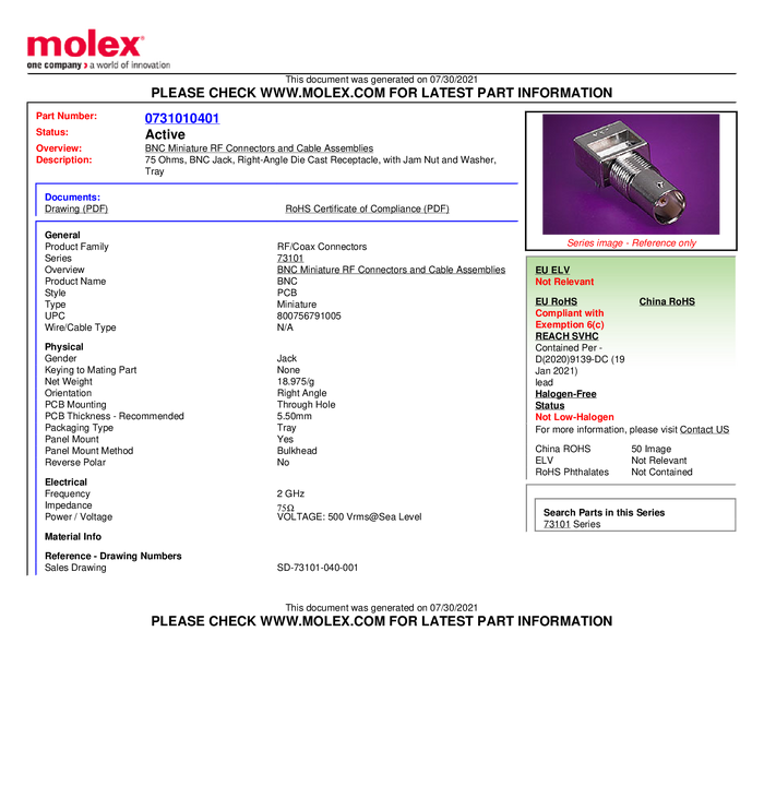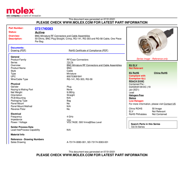 Złącze BNC Molex Molex MOL DataCom & Specialty 731740073 złącze męskie 50 Ω 1 szt.