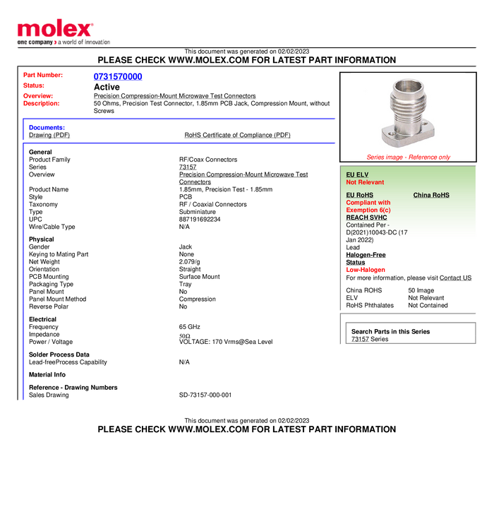 Specjalne złącza Molex Molex MOL DataCom & Specialty 731740040 gniazdo 50 Ω 1 szt.