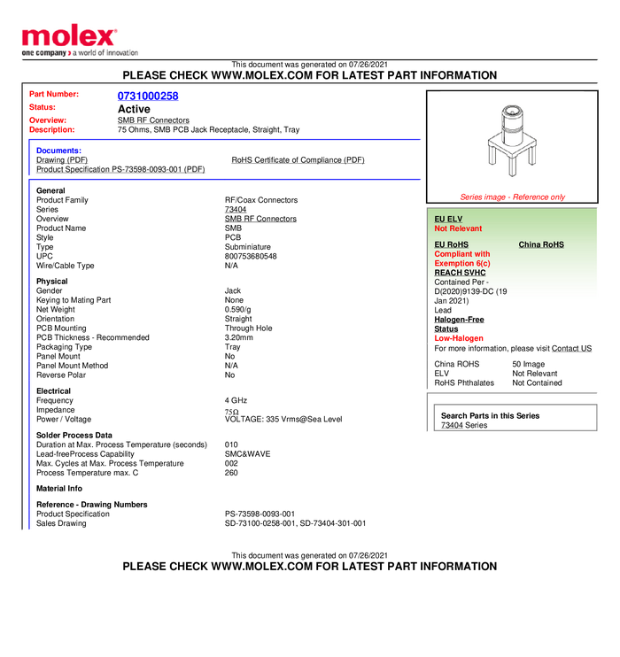 Złącze SMB Molex Molex MOL DataCom & Specialty 731000258 gniazdo 75 Ω 1 szt.