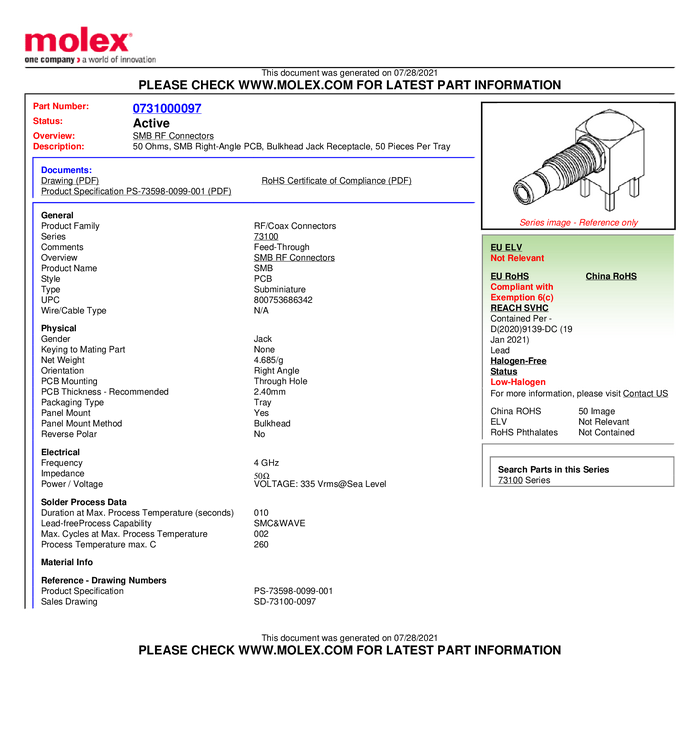 Złącze SMB Molex Molex MOL DataCom & Specialty 731000097 gniazdo 50 Ω 1 szt.