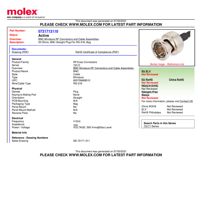 Złącze BNC Molex Molex MOL DataCom & Specialty 731713110 złącze męskie 50 Ω 1 szt.