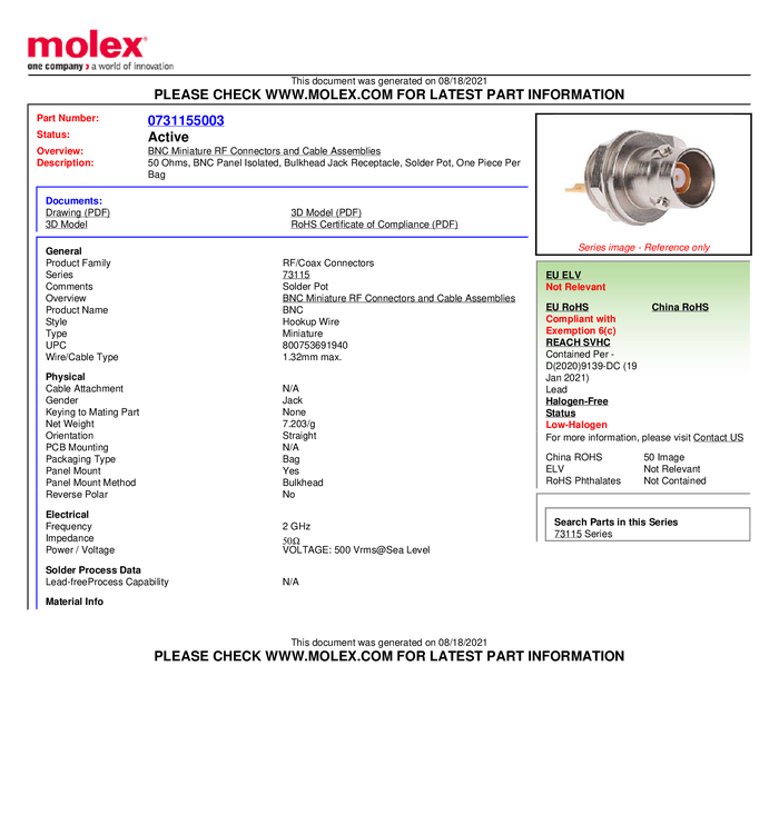 Złącze BNC Molex Molex MOL DataCom & Specialty 731485003 gniazdo, złącze męskie 50 Ω 1 szt.