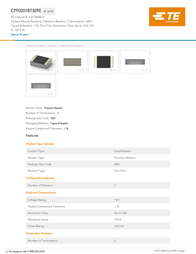 TE Connectivity 1-2176448-4 Rezystor precyzyjny 732 Ω SMD 0201 0.1 % 25 ppm 1 szt. taśma na dużej rolce