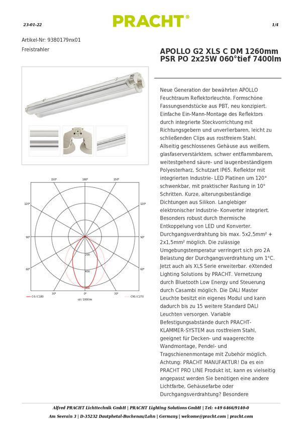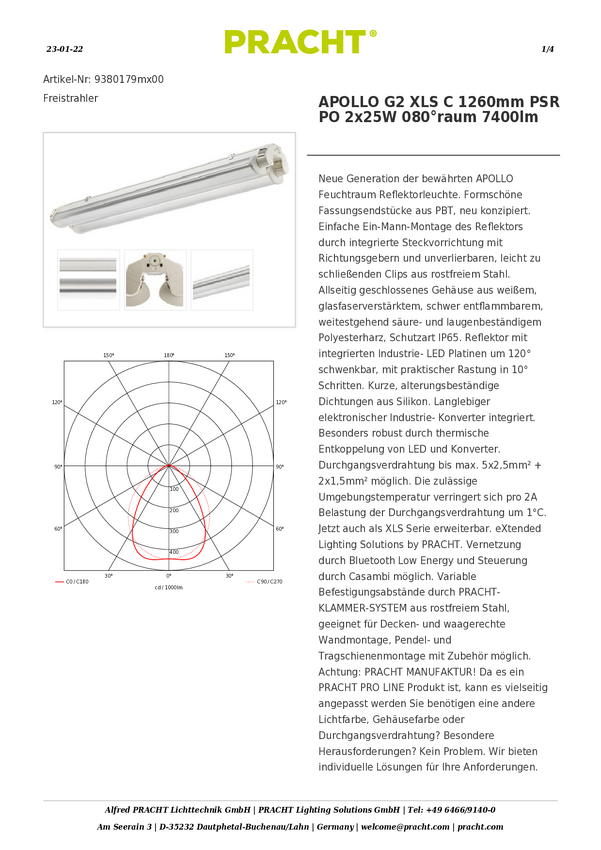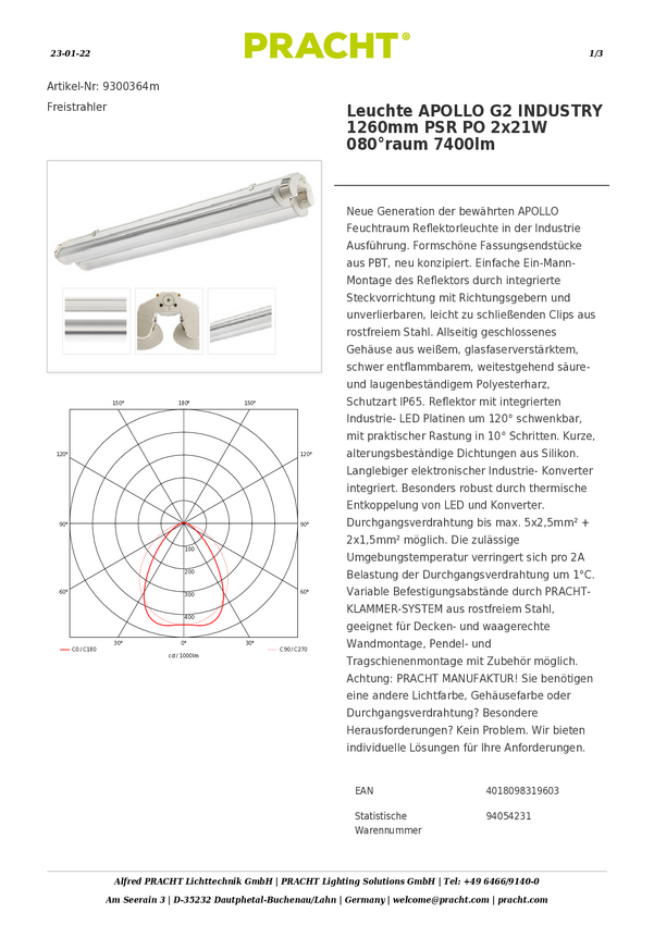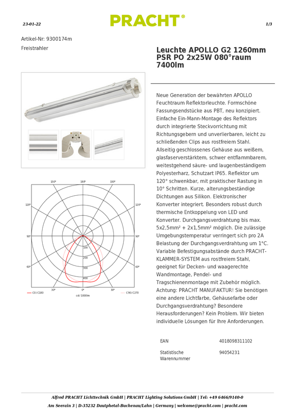 Lampa LED do wilgotnych pomieszczeń Pracht 9380179wx00 9380179wx00, 50 W, 7400 lm