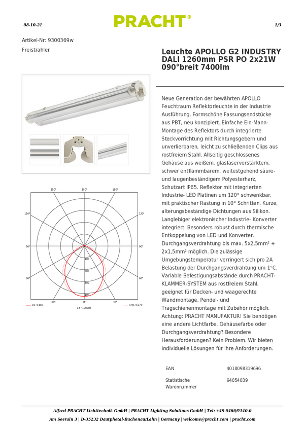 Lampa LED do wilgotnych pomieszczeń Pracht 9380179mx00 9380179mx00, 50 W, 7400 lm