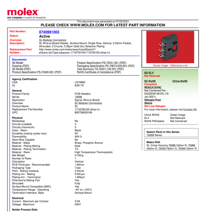Molex 740991003 Listwa kołkowa, męska, do wbudowania, standardowa Molex MOL Power & Signal Sol., piny: 3, 3 A, 1 szt.